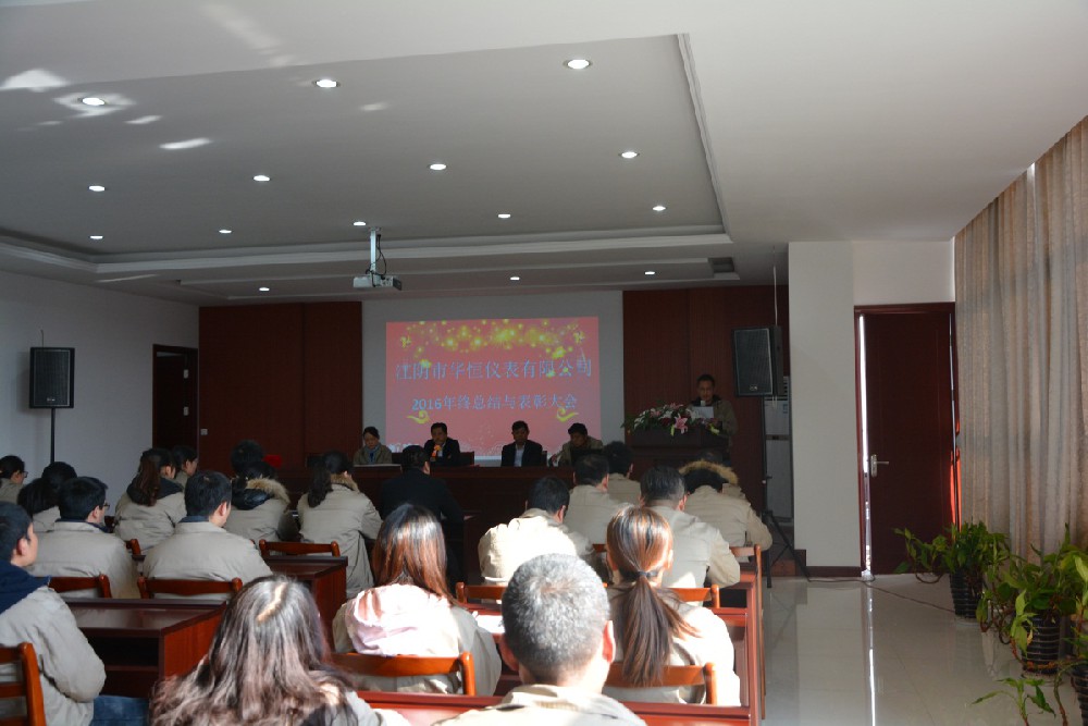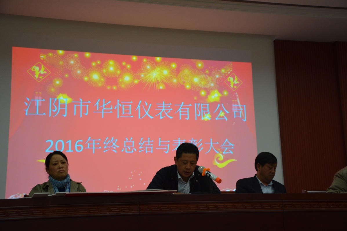 2017年1月23日,江陰市華恒儀表有限公司“2016年度總結與表彰大會”在公司大樓三樓會議大廳隆重舉行。公司董事長曹軍華先生、總經理黃冬華先生、財務總監耿敏女士及全體員工共聚一堂、回望總結、共賀勝利、展望未來。
